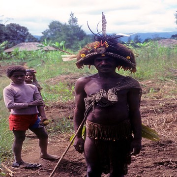 Huli man and his children, on his property, Papua New Guinea (see also next image)