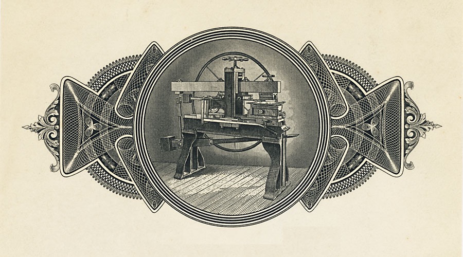 Transfer presses, with their huge "spider wheel", were used to "roll in" engravings from hardened steel transfer rolls into soft steel printing plates,
