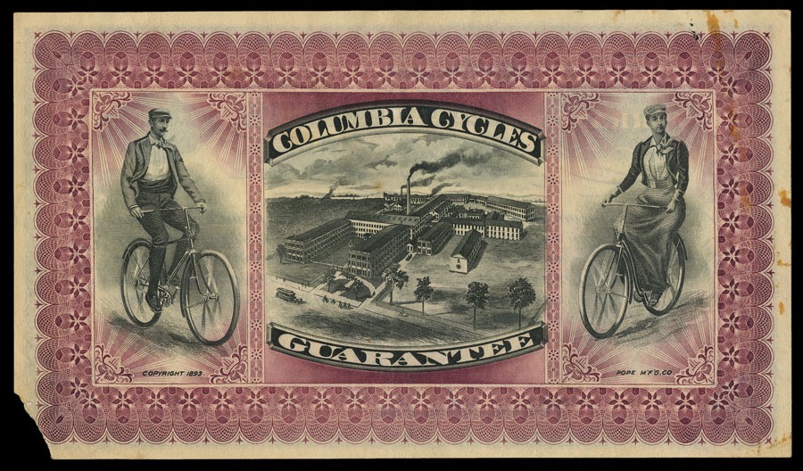 One side of a banknote-engraved certificate, 1893, by John A. Lowell & Company. Signed by Albert A. Pope, President.