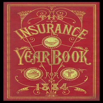 Stamped front cover board of a hardcover book, "The Insurance Yearbook. 1884-85, Carefully Corrected To June 20. 1884", The Spectator Company, New York, Chicago, 1884