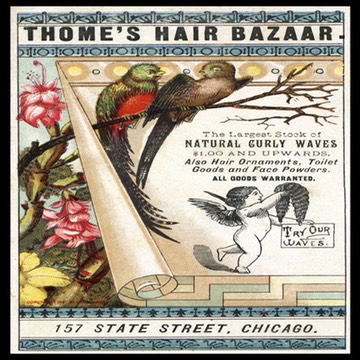 Stock trade card with black printing added for Thome's Hair Bazaar