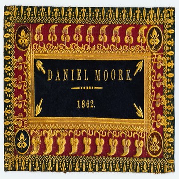 A hand-tooled leather label or bookplate (ex libris), slightly more than three inches wide