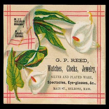 Victorian trompe-l'oeil trade card. This one carrries the "lifted corner" simulation further than most, by having the lifted corner pinned open.