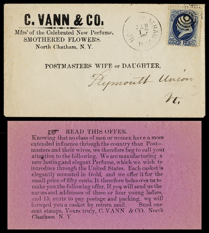 Advertising cover and contents, and enclosed marketing appeal to the local postmaster's wife or daughter