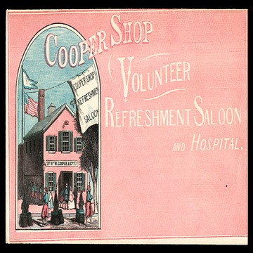 All-over front design envelope, unused. A Civil War Sanitary Fair facility, the Cooper Shop Volunteer Refreshment Saloon and Hospital on Otsego Street in Philadelphia began operation on May 27, 1861. Ten days before, on May 17, 1861, a similar operation, The Union Volunteer Refreshment Saloon and the Union Volunteer Hospital, opened. Activities continued at the Cooper Shop until December 1, 1865, serving over 315,000 meals to soldiers and raising almost $58,000 for aid to soldiers.