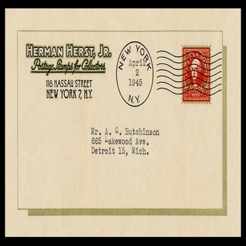 Letterhead of stamp dealer and writer Herman Herst, 1945, with simulated cover and facsimile stamp design