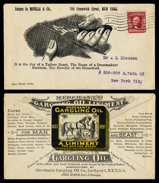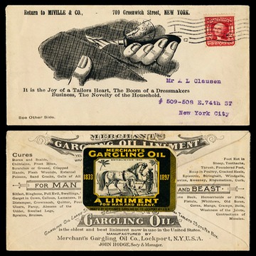 Advertising cover. The Merchant's Gargling Oil Company of Lockport, New york supplied envelopes with their own ads on the back to all sorts of businesses.