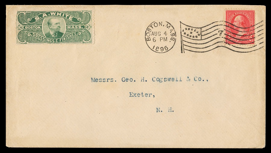 Advertising cover, 1896. The "corner card" is in the form of a perforated adhesive stamp / label.