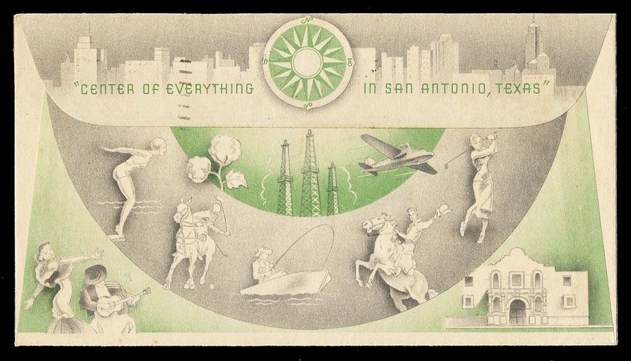 All-over graphics on the back of an advertising cover from San Antonio, Texas, postmarked September 13, 1948