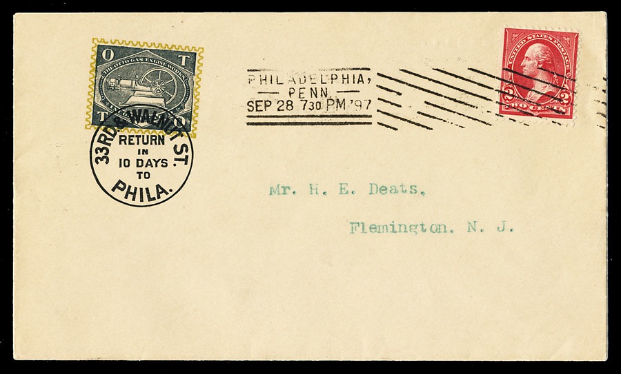 Advertising cover with facsimile stamp and facsimile Philadelphia circular date stamp cancellation, 1897.