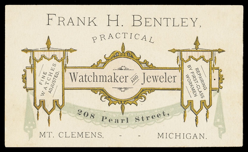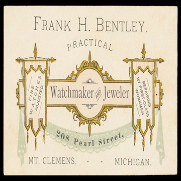 Trade card. The text on the back is novel: A QUAKER'S LETTER I herewith send thee my pocket watch, which greatly standeth in need of friendly correction. It has been more than two years since it was last at thy friendly school; truly it hath done wonders in denoting the correct time of day for so long, without having been cleansed, and I give thee credit for being a good and faithful workman. But recently, I perceive, by the index of his mind, that he is a liar and the truth is not in him; that his motions are wavering and irregular; that his pulse is sometimes quick, which betokeneth not an even temper; and at other times it waxeth sluggish, notwithstanding I frequently urge him. When he should be on duty, as thou knowest his ususl time denoteth, I find him slumbering, or, as the vanity of human reason phraseth it, catch him napping. Examine him, ascertain what aileth him, draw him from the error of his ways, and show him the path wherein he should go. Cleanse him with thy charming medicine from all pollution, that he may vibrate and circulate freely. Do thou regulate his motion for the time to come by the motion of the light that ruleth the day, and when he is completely cured, then do thou send him home, with a just bill of charges, and then it shall be sent thee in the root of all evil.