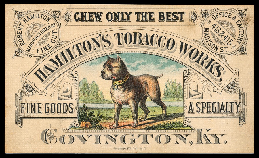 Trade card. The dog, "Champion", seems clearly the source for his image on the two preceding somewhat later cards.