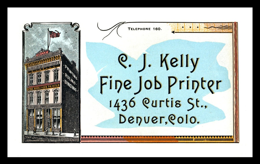 Trade card specimen by C. J. Kelly of Denver, 1888. (Collection of Joe Freedman)