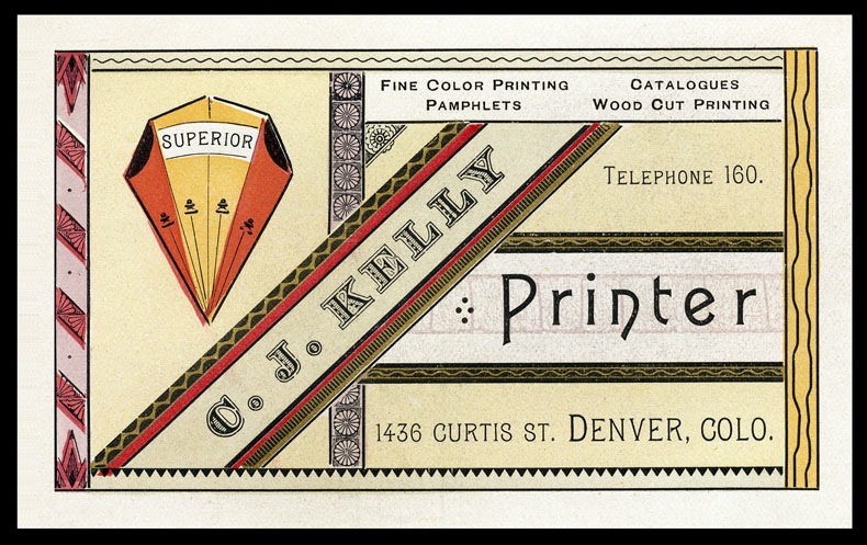 Trade card specimen by C. J. Kelly of Denver, 1888. (Collection of Joe Freedman)