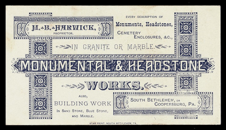 Trade card. Very heavy in feeling, perhaps appropriate for a maker of monuments and headstones.