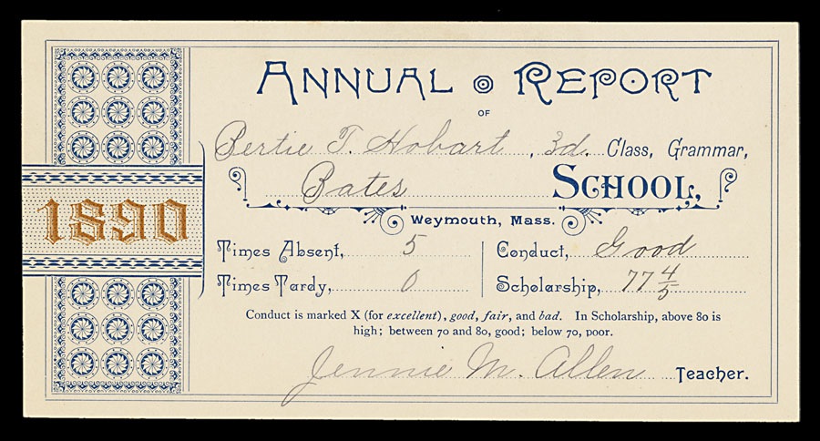 Weymouth, Massachusetts pupil's report for the 1890 school year