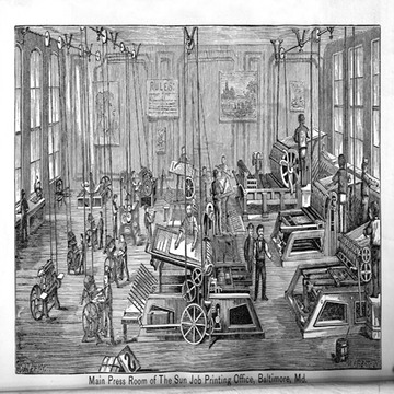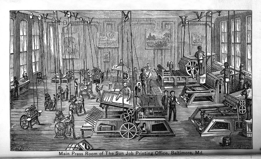 The specimen book of C. J. Kelly of Denver, 1888, was for some reason privately bound in the 19th century with a booklet from the Baltimore Sun, which contained historical text and printed specimens of the Sun's work. It also contained this view of the Sun's main press room. The publication was entitled