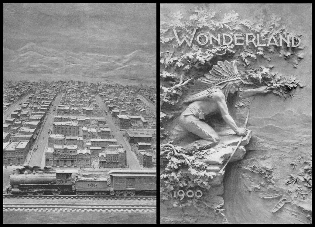 Booklet covers. From 1884 through 1914, the Northern Pacific Railway published a promotional booklet each year extolling the wonders of the Yellowstone National Park. The booklets for 1900 through 1903 featured modelled clay covers, as well as several modelled section headers inside. (Courtesy of SharingHistory.com)