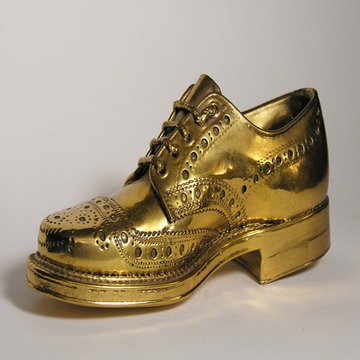 A gold-plated, brand-new wingtip shoe, a window display for a shoe store, 10 1/2" long.