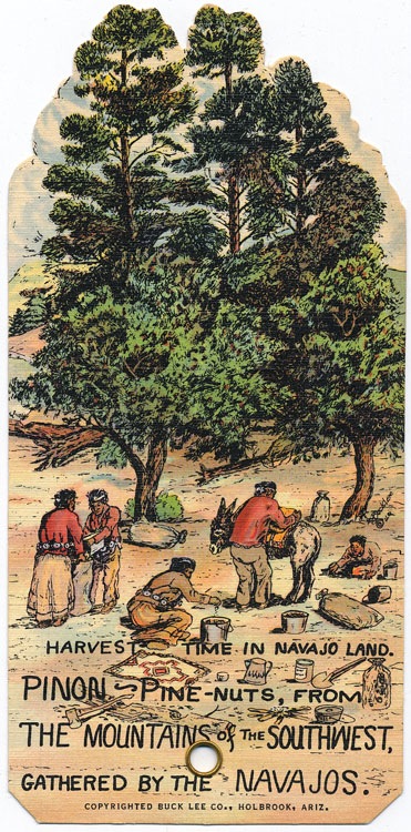 Diecut, postcard back, published by Buck Lee's Southwestern Products Studio, with grommet to attach a souvenir bag of pinon-pine nuts