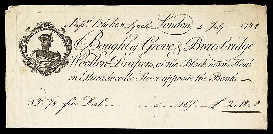 Billhead for woolen-drapers, 1739, at the sign of the "Black-moor's Head"