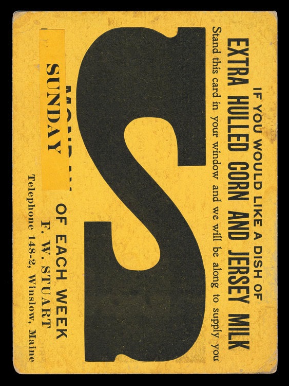 Window card, for those wishing delivery of a "dish of extra hulled corn and Jersey milk".