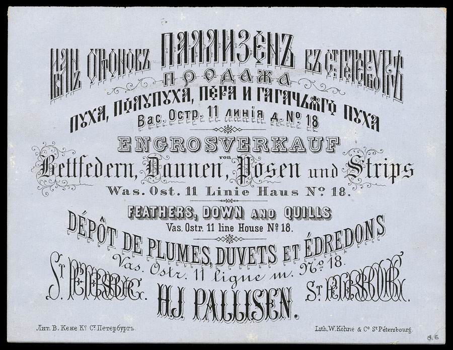 Russian trade card, St. Petersburg, 19th century, in four languages