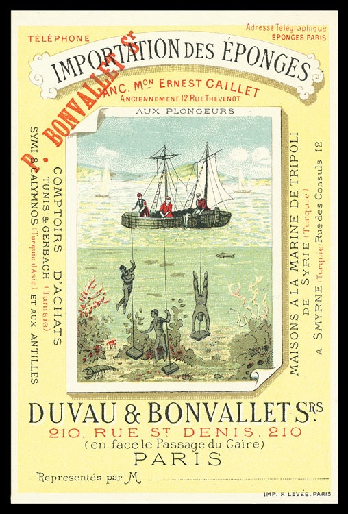 Trade card for sponge merchant depicting sponge divers