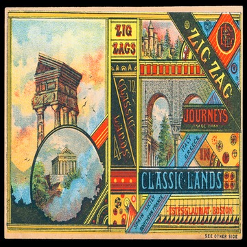 Trade card promoting one of several "Zig Zag Books", this one "Journeys in Classic Lands"