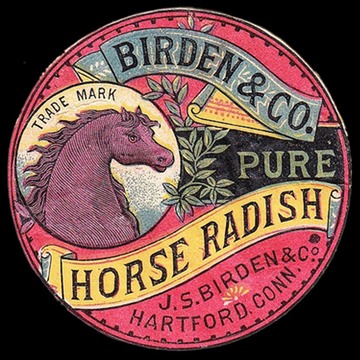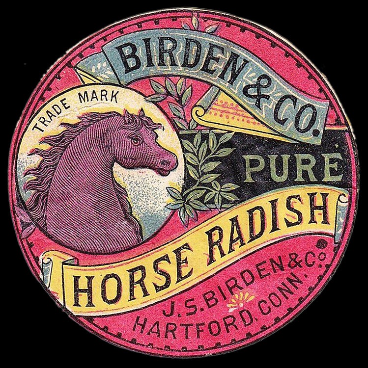 A horseradish label, apparently a cutout. It is always interesting to see how designers deal with design inside a circular space.