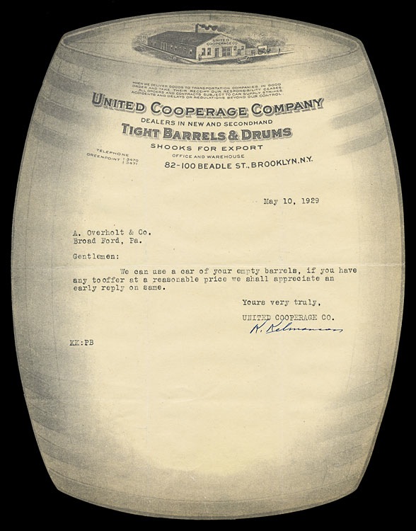 Letterhead, diecut in the shape of a barrel, 1929