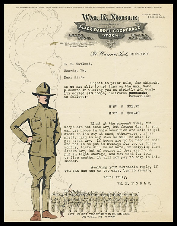 Letterhead, 1919, featuring a soldier in WWI uniform. "Slack barrel cooperage stock"