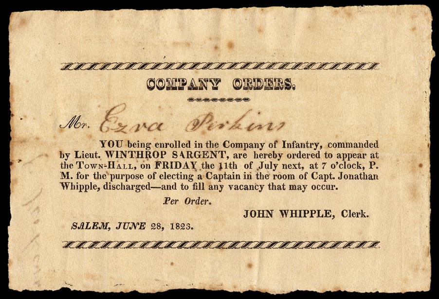 Salem, Massachusetts 1823. Ezra Perkins being ordered to report.