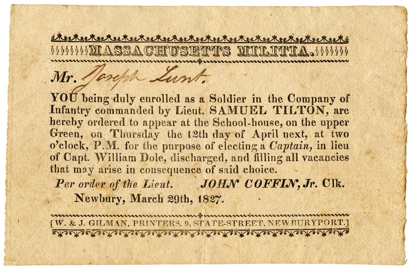 Newbury, Massachusetts 1827. This notice orders its militia members to assemble to elect a replacement Captain.