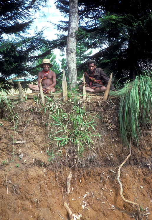 Two huli men sitting on a bank, watching a milling crowd below on election voting day.