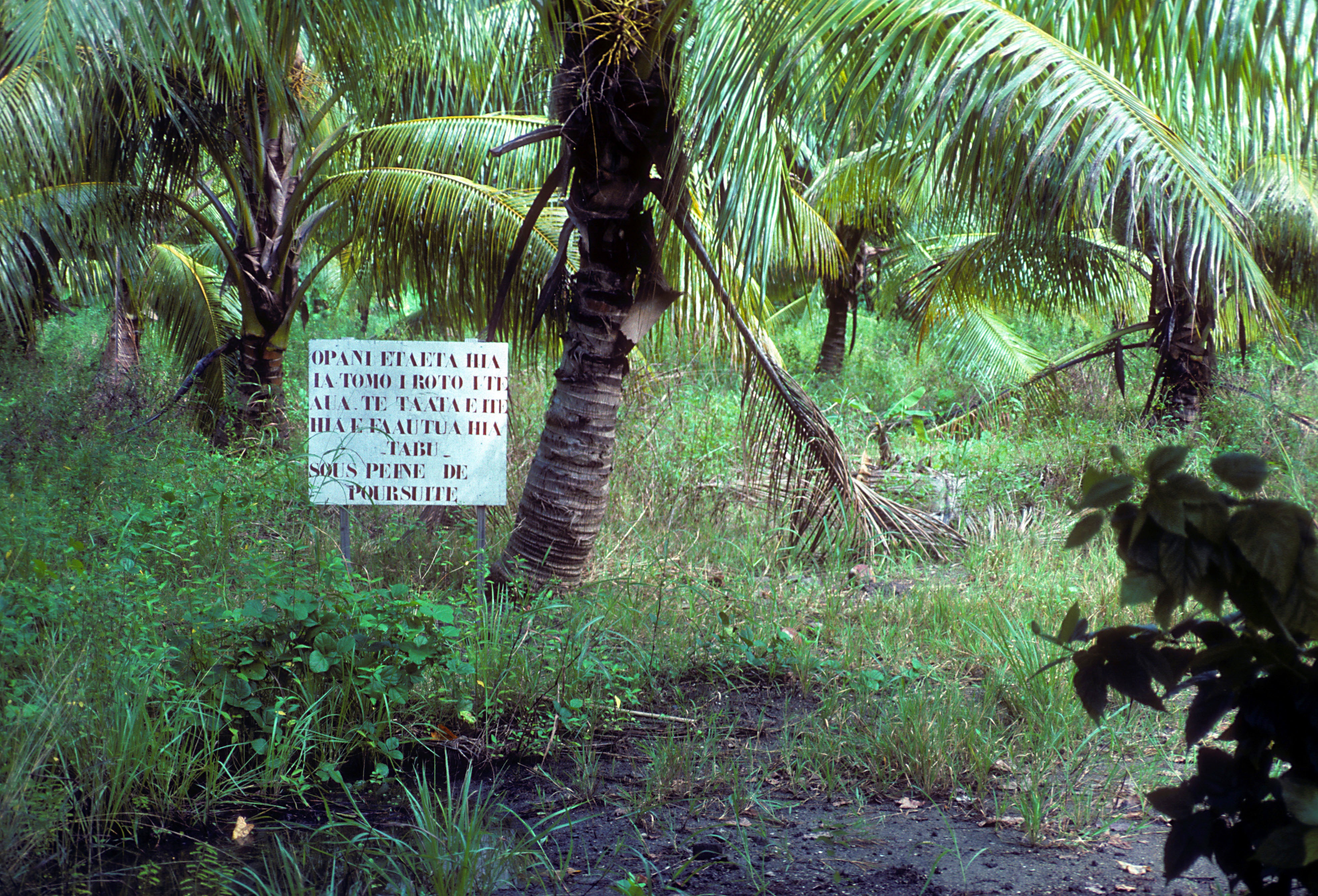 A "TABU" ( forbidden, keep out ) sign in Bora Bora, Tahiti. Also a bit of French; Tahiti is in French Polynesia.