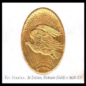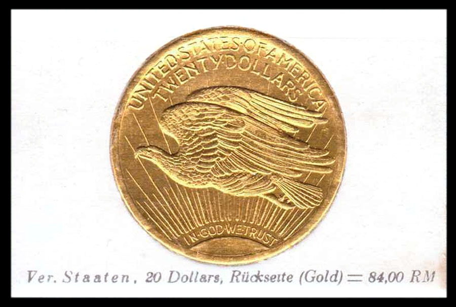 One of a set of embossed, metallic stamped cards showing worldwide coinage ( not in Sheaff collection )
