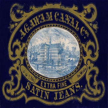 Fabric label, unusual in that a woodcut factory image is mounted to show through an oval hole cut in the center