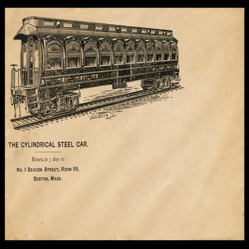 Advertising envelope showing unusual all-steel railroad passenger car (also see next item)
