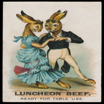 Here, the image itself is off-the-wall—formally dressed dancing rabbits—and this stock card was chosen to promote the sale of beef!