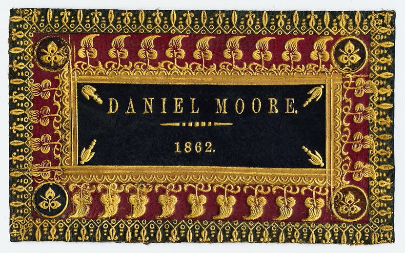 A hand-tooled leather label or bookplate (ex libris), slightly more than three inches wide
