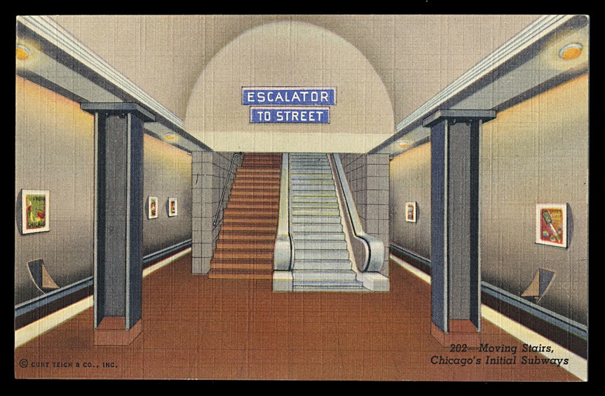 A Curt Teich linen postcard showing a reversible escalator in Chicago's first subway, two routes covering 8 3/4 miles.