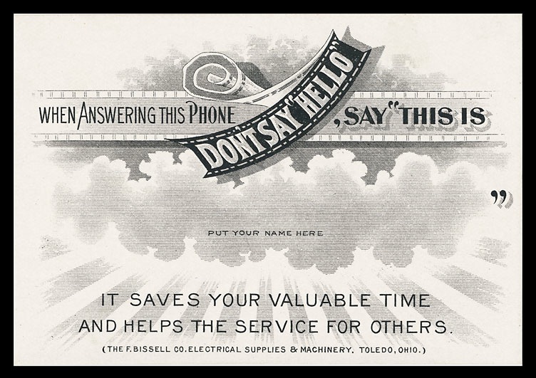 Very interesting card, shedding a bit of light on early telephone etiquette. Evidently, this card with it's suggestion about how best to answer the telephone,