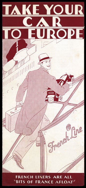 Multi-fold brochure, 1933. Images show personal automobiles, boats, airplanes and an elephant (!) being hoisted aboard French Line ships.