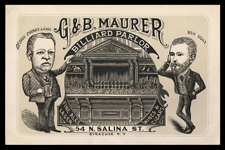 Billiard parlor trade card, with portrait images of the two Maurers. "George drinks lager, Ben Don't" (not in RDS collection)
