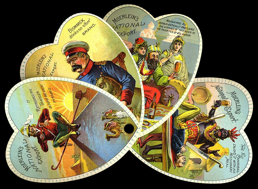 Unusual trade card, four heart-shaped cards that fan out, held by a rivet