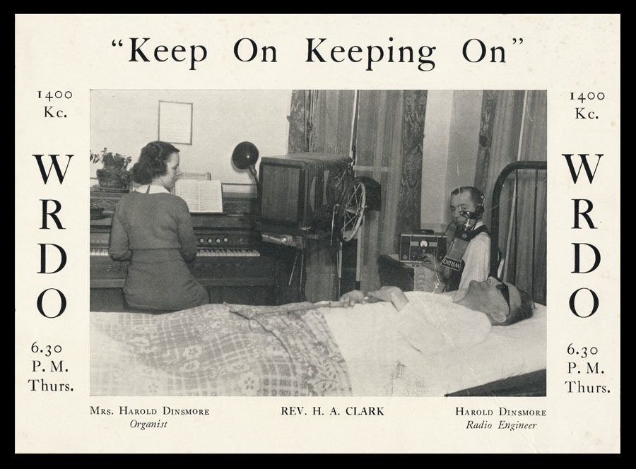 Large promotional card from a Reverend who broadcast over WRDO in Augusta, Maine from his bed,