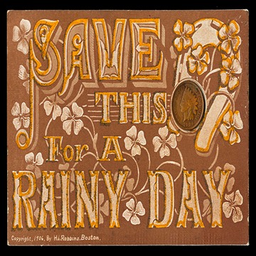 Postcard, unused. A real 1906 Indian Head penny attached to a Copyright 1906 postcard. Produced by H.I. Robbins, Boston.