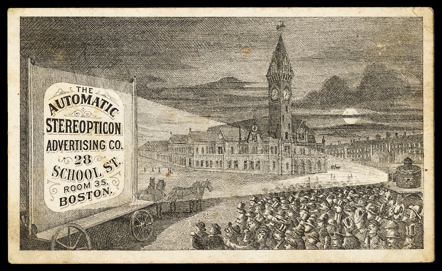 Trade card. "Works all night. It displays your Advertisement to wondering crowds. STRICTLY CASH IN ADVANCE" ( Collection of George K. Fox )
