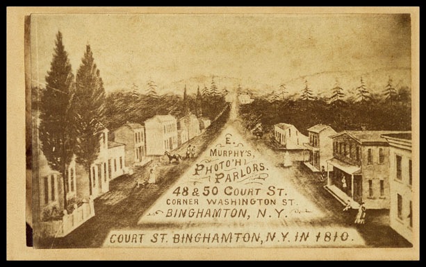 Photograph of a folk art painting of Binghamton, NY adapted into an advertising card for Murphy.